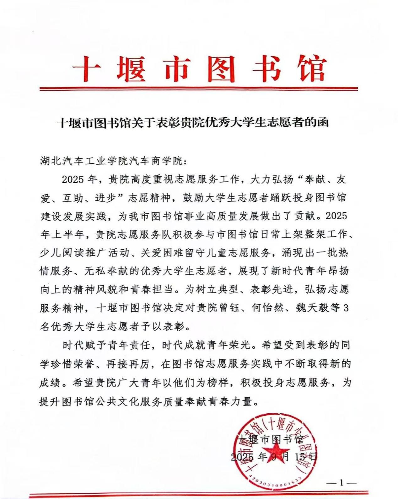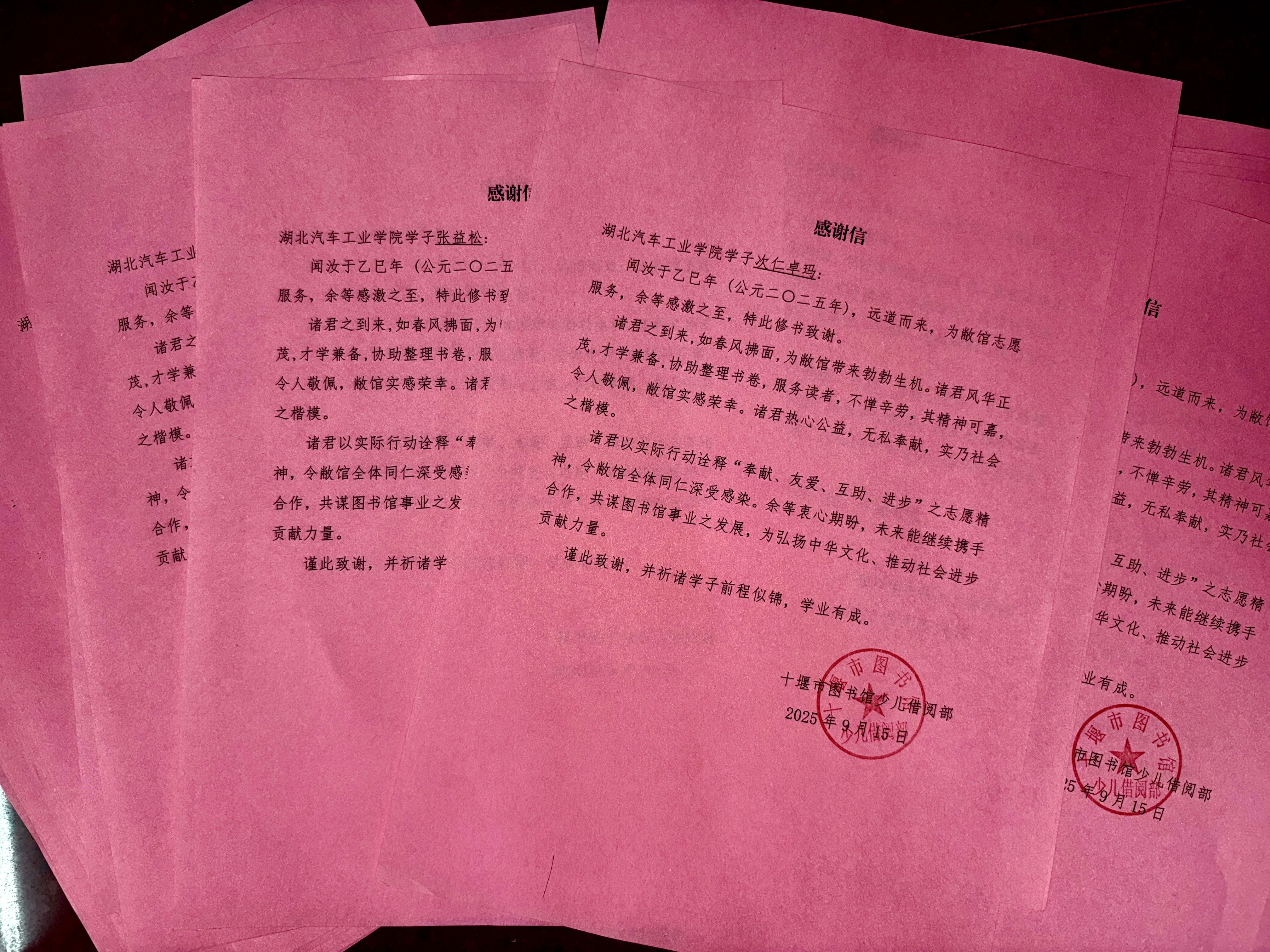 近日,汽车商学院收到一封来自十堰市图书馆少儿借阅部的感谢信,信中高度赞扬了学院志愿者在2025年以来提供的优质志愿服务,并对他们展现的专业素养与青春担当予以充分肯定。
