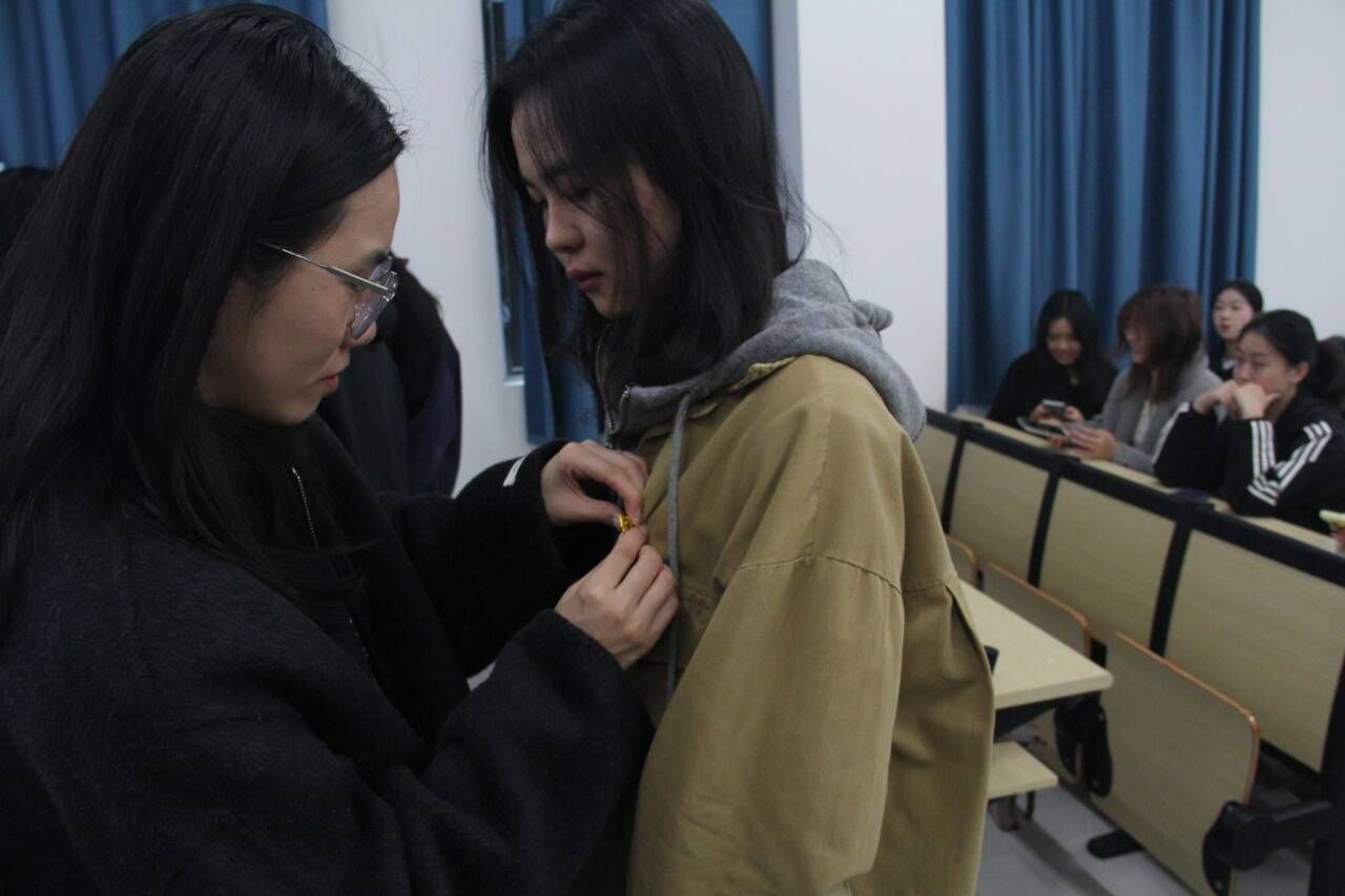 仪式在庄严的国歌声中拉开序幕。主持人宣读新团员名单,每一个名字都代表着一份青春的承诺与成长的跨越。随后,与会老师为新团员佩戴团徽。熠熠生辉的团徽不仅是一份荣誉,更象征着责任与担当,激励新团员牢记使命、奋勇前行。“我志愿加入中国共产主义青年团……”在贾肖箭的带领下,新团员面向团旗,举起右拳庄严宣誓。铿锵有力的誓言在教室中回荡,展现了青年一代坚定不移跟党走、矢志奋斗的信念与决心。紧接着,新团员代表胡欣雨在发言中表达了对共青团的向往与未来的奋斗目标,言语中洋溢着青春的热忱与担当。优秀团员代表危笑结合自身经历,鼓励新团员珍惜韶华、锤炼本领、争当先锋,展现了共青团组织的传承力量与温暖底色。
