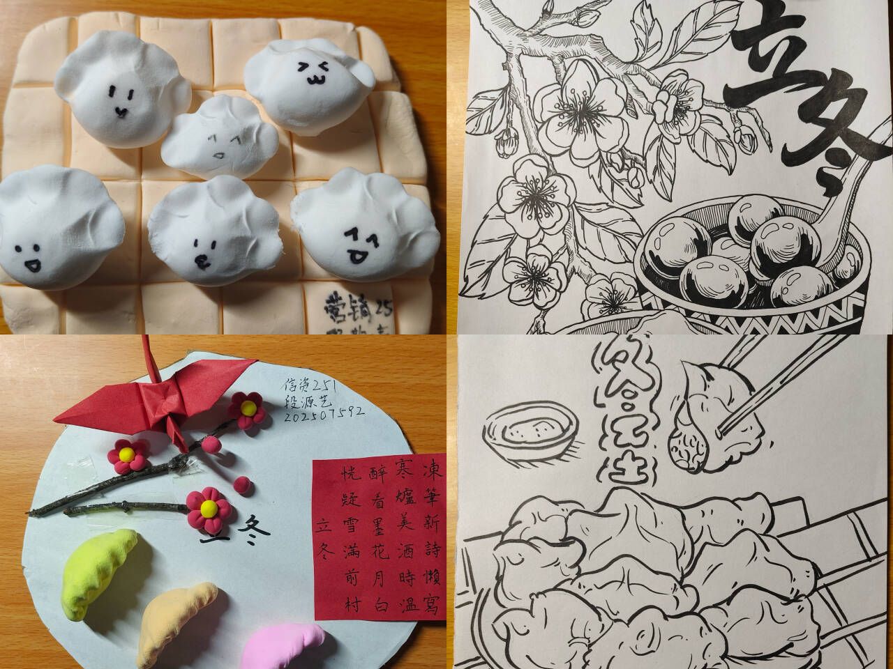 活动现场暖意融融、创意涌动,热烈的氛围感染着每一位参与者。学子们怀揣对传统文化的热爱与创新热忱投入创作,桌上的彩泥、卡纸、水彩笔等材料被充分盘活:彩泥捏制的萌趣卡通饺憨态可掬,卡纸搭建的层叠立体饺错落有致,水彩勾勒的诗意节气饺意境悠远。每一件作品都是对 “立冬饺韵” 主题的生动诠释,更是对民俗文化的年轻化表达。创作过程中,同学们相互分享思路、探讨节气知识,在思维碰撞中深入了解冬至节气的起源演变,真切体悟饺子承载的团圆和睦寓意,让传统文化的深厚底蕴在互动交流中浸润心灵。