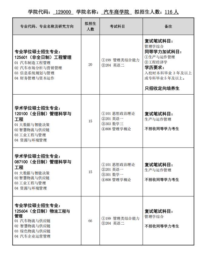 汽车商学院2026年硕士研究生考试内容和范围统计表